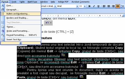 Pentru a introduce o lista, initial trebuie selectata zona care se doreste a se introduce intr-o lista, dupa care se actioneaza meniul Format -> optiunea Bullets and Numbering , asemeni imaginii de mai jos.
