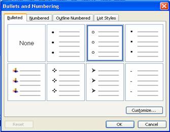 Pagina Bulleted contine marcatori pentru liste neordonate. Daca nici unul dintre acesti marcatori nu ne satisface, se poate accesa butonul Customize, care permite cautrea altui tip de marcaj, pozitia, dimensiunea si culoarea acestuia.