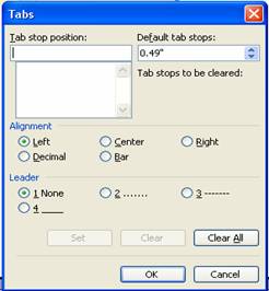pe rand pozitiile lor din lista, cid oar prin activarea butonului Clear All. O alta varianta de stergere a tabulatorilor, este prin folosirea riglei orizontale, tragand in afara riglei simbolul tabulatorului.