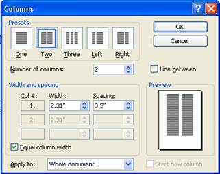 zona Width and Spacing permite dimensionarea coloanelor si a spatiului dintre acestea in functie de optiunea aleasa in zona Presets