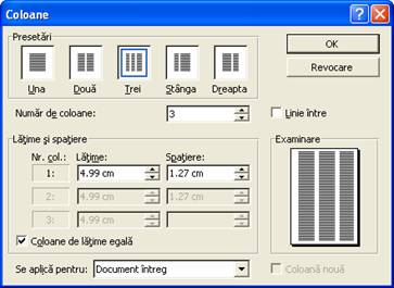 Din meniul Format se alege comanda Coloane, prin care se afiseaza o fereastra de dialog cu acelasi nume.