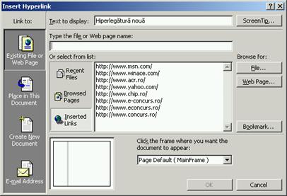 n Web Page. (pagina Web) - deschide o fereastra a browser-ului de Internet pentru a putea cauta o pagina din Internet la care vrei sa faci legatura;