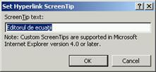 Screen Tip. (indicatii de ecran[1]) - apasarea acestui buton are ca efect afisarea casetei de dialog Set Hyperlink ScreenTip īn care trebuie inserat textul care vrei sa apara ca o indicatie de ecran (vezi a doua imagine);