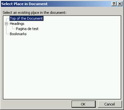 n Bookmark... (semn de carte) - permite selectarea unui semn de carte din document, de unde va face afisarea; aceste semne de carte sunt definite automat pentru titlurile de documente sau de utilizator oriunde īn cadrul documentului; acest buton afiseaza caseta de dialog Select Place in Document īn care sunt afisate toate semnele de carte;