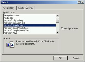 n Selectezi comanda Object. din meniul Insert. Pe ecran va fi afisata caseta de dialog Object, iar din lista Object type: selectezi valoarea Microsoft Excel Chart, ca īn imaginea urmatoare.