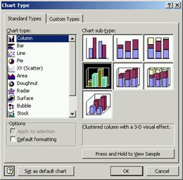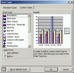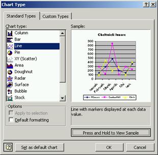 n Selecteaza comanda Chart Type. din meniul Chart sau din meniul rapid. Este afisata caseta de dialog Chart Type, care are doua fise cu tipuri de grafice ca īn imaginile urmatoare.