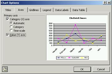 n Axa Y (verticala) - contine o scara de valori pentru a permite identificarea valorilor reprezentate prin linii, bare sau puncte de suprafata.