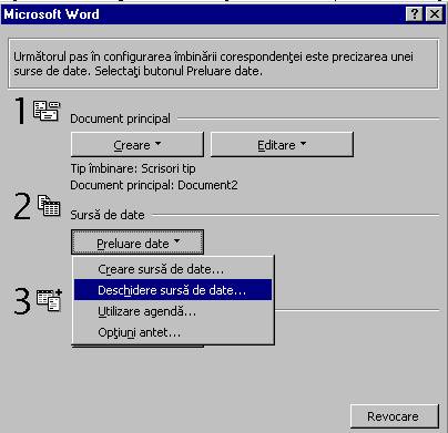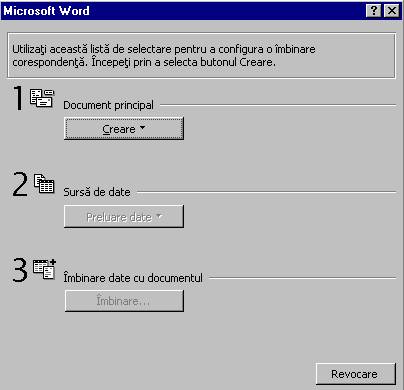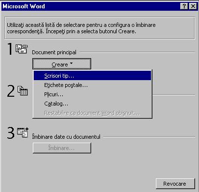 O alta metoda este optiunea Īmbinare corespondenta (Mail Merge) īn meniul Instrumente. Aceasta optiune lanseaza Mail Merge Wizard.