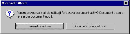 Interpretarea documentului creat ca document principal presupune alegerea butonului Fereastra activa deoarece altfel se va propune crearea unui nou document prin intermediul optiunii Document principal nou.