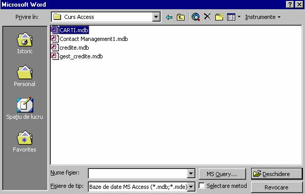 Se specifica denumirea bazei de date Access la care va fi legat documentul Word, iar la rubrica Fisiere de tip se alege Baze date MSAccess .