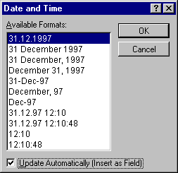 Selectarea comenzii Insert-Date and Time are ca efect afisarea casetei de dialog Date and Time cu ajutorul careia puteti insera data si ora īntr-un document, īn formatul dorit. Pentru actualizarea automata a orei sau datei atunci cānd tipariti documentul, selectati caseta Update Automatically.