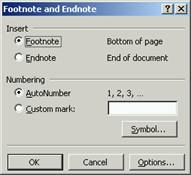 n Selecteaza comanda Footnote. din meniul Insert. Aplicatia afiseaza caseta de dialog Footnote and Endnote ca în figura urmatoare.