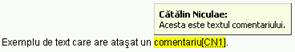 Când deschizi un document care contine comentarii ele pot fi identificate prin culoarea galbena, asa cum se vede în imaginea urmatoare. Continutul comentariului poate fi vizualizat într-o caseta care apare cât timp este pozitionat indicatorul mouse-ului pe comentariu sau într-o sectiune a ferestrei plasata în partea de jos.