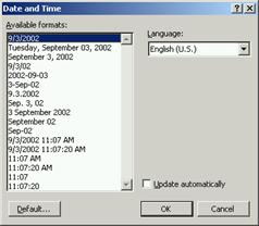 n Selectezi comanda Date and Time. din meniul Insert. Pe ecran va fi afisata caseta de dialog Date and Time ca în figura urmatoare:
