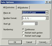 Place at: (plaseaza la) – permite stabilirea locului de amplasare al notei prin selectarea uneia din cele doua valori: Bottom of page (la sfarsitul paginii), Beneath of text (sub textul ultimului paragraf).