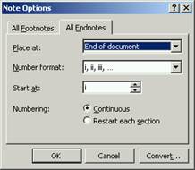 Place at: (plaseaza la) – permite stabilirea locului de amplasare al notei prin selectarea uneia din cele doua valori: End of section (la sfarsitul sectiunii), End of document (la sfarsitul documentului).