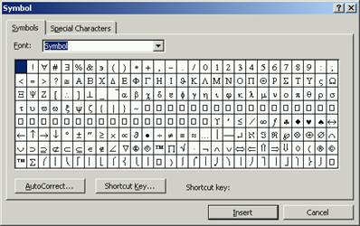 Symbol… – afiseaza caseta de dialog Symbol care permite selectarea unui simbol.