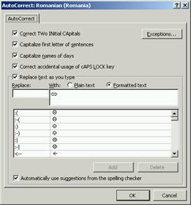n Apasa butonul AutoCorrect…. Pe ecran va fi afisata caseta de dialog AutoCorrect in care este inserat simbolul selectat in campul With:, ca in imaginea urmatoare.