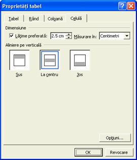 întregului tabel), dupa care, din Tabel Proprietati tabel. se va alege sectiunea Celula Aliniere pe