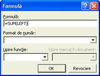linie. Se plaseaza cursorul în celula rezultat, iar din meniul Tabel se alege optiunea Formula., urmata de