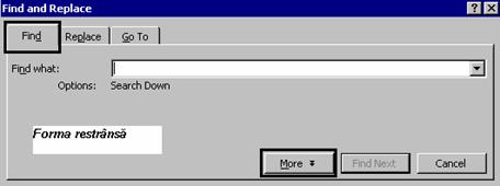 In urma apelarii acestei comenzi, pe ecran apare caseta de dialog Find