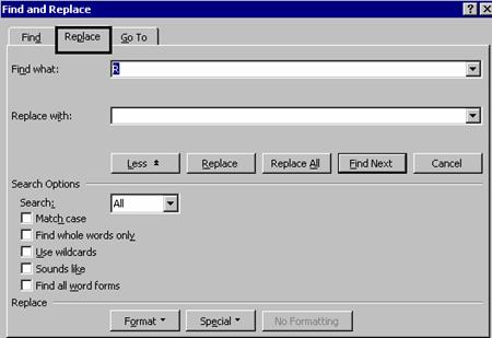 In procesul de editare a documentului de multe ori este nevoie sa deplasezi rapid punctul de inserare la o anumita pozitie in document (la un cuvant, la un tabel, la un caracter special, o anumita pagina ,etc.) sau sa inlocuiesti un caracter (cuvant) cu altul. Asa cum ai invatat in Cursul I-RPB-041-01 poti cauta si inlocui rapid un caracter sau un sir de caractere folosind comenzile din meniul Edit. Editorul Word este capabil sa gaseasca si sa inlocuiasca text, optiunile de formatare, caracterele speciale (cum ar fi tabulatoarele si cratimele), marcajele pentru notele de subsol, cadrele si altele cu alte formatari sau alt text, sau sa pastreze formată 939d38j ;rile si sa inlocuiasca doar textul.