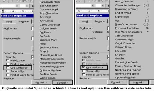 Pentru a extinde operatiile de cautare sau inlocuire a caracterelor sau textului, poti utiliza wildcards (caractere de inlocuire) care sunt specificate in meniul butonului Special. Pe masura ce le selectezi, acestea sunt adaugate in caseta Find What.