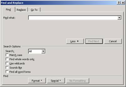 Īn zona Find se gasesc trei butoane care permit specificarea formatarilor cautate, a caracterelor speciale sau a obiectului cautat: