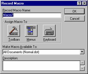 Dupa ce atribuiti o cale de rulare macrocomenzii, Word va afisa bara cu instrumente de lucru MacroRecord si va lipi de cursorul mouse-ului o pictograma de forma unei casete audio ca sa nu uitati ca sunteti în timpul unei înregistrari. De asemenea, indicatorul REC de pe bara de stare va fi înnegrit, pentru cazurile când caseta de lânga cursor nu va spune nimic. Acum înregistrati secventa de comenzi pe care vreti sa le refolositi. Daca vreti sa executati o operatie pe care nu vreti sa o înregistrati, puteti sa întrerupeti în orice moment înregistrarea, executând un clic pe butonul Pause. Executati din nou un clic pe butonul Pause ca sa reluati înregistrarea. Pentru oprirea înregistrarii, executati un clic pe butonul Stop, executati dublu clic pe indicatorul REC de pe bara de stare sau selectati Tools-Macro Si executati un clic pe butonul Stop Recording din caseta de dialog Macro.