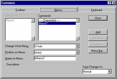Daca selectati butonul Menus, alegeti un meniu din lista derulanta Change What Menu. Word va sugera meniul Tools. Stabiliti pozitia macrocomenzii în meniu, alegând o optiune din lista derulanta Position on Menu (sau lasati selectata optiunea Auto si Word va alege cum crede ca este mai bine), apoi redactati numele optiunii care va aparea în meniu în rubrica Name on Menu.
