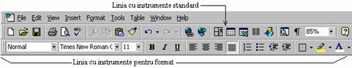 v Linii cu instrumente - Programul Word are mai multe linii cu instrumente, fiecare linie fiind alcatuita din obiecte grafice asociate cu o anumita categorie de facilitati. La un moment sunt afisate pe ecran (si disponibile sa fie utilizate) doar o parte din aceste linii cu instrumente, alegerea lor fiind facuta de catre utilizator, adica de catre dumneavoastra, n functie de natura documentului la care lucrati si de operatiile pe care le efectuati asupra lui. n mod implicit sunt afisate pe ecran doua linii cu instrumente care contin butoane asociate facilitatilor folosite mai frecvent: linia cu instrumente standard si linia cu instrumente pentru format. Mai jos sunt afisate aceste linii cu instrumente, pe care le veti cunoaste foarte repede, daca nu le cunoasteti deja.