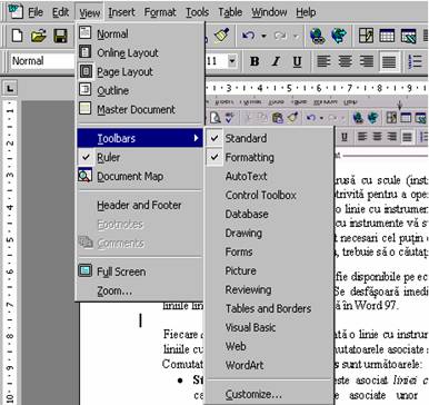Apelati comanda View Toolbars. Se desfasoara imediat un submeniu cu toate liniile cu instrumente care exista īn Word.