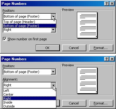 Pasul 2: Selectezi pozitionarea numarului de pagina din caseta Position;