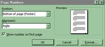 Pentru numerotarea paginilor mergeti la comanda Insert, Page Numbers.
