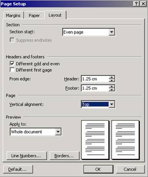 Antetul sau subsol sunt vizibile doar in modul de vizualizare Print Layout si, implicit, parametrii de machetare sunt aceeasi in tot documentul. Pentru ca intr-un document sa se poata distinge un antet/subsol de altul este necesar ca dupa activarea comenzii meniu View - comanda Header and Footer, sa se acceseze si comanda meniu File - comanda Page Setup (Fig. 3. 38). In eticheta Layout se vor face setarile necesare si numai dupa aceea se vor completa antetele/subsolurile documentului.