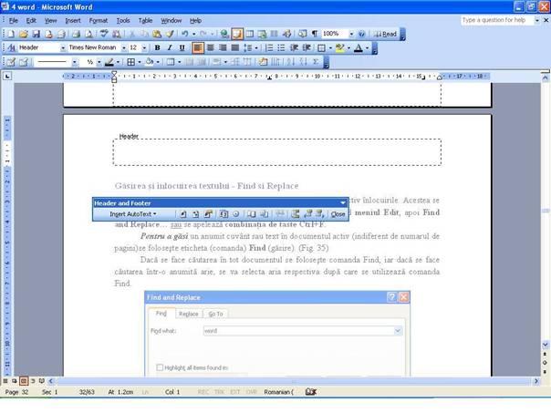 Selectati comanda Header and Footer: in cadrul marginii de sus a documentului va apare un chenar cu linie intrerupta in interiorul caruia este fixat automat punctul curent de inserare, iar mai jos va apare si o bara cu instrumente specifice procesului de creare a unui antet sau a unei note de subsol (Fig. 3. 39);