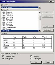 Daca doriti sa dati un anumit format tabelului, accesati cu clic-stanga butonul AutoFormat, alegeti categoria de tabel din caseta cu lista derulanta Category, apoi formatul dorit din caseta cu lista Table styles care vi se ofera in cadrul casetei de dialog Table AutoFormat dupa care validati alegerea facuta - alegeti OK (Fig. 3. 54);