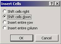 Daca se doreste sa se adauge celule (se alege optiunea Cells.) apare caseta de dialog urmatoare in care se selecteaza varianta dorita si se apasa butonul OK.