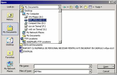 Din caseta de dialog Open se selecteaza una din unitatile de disk care contine documentul cautat (Fig. 3.11);