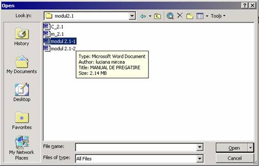 Selectarea fisierului cautat, dupa care se acceseaza butonul Open sau mai rapid, dublu clic-stanga pe document (Fig. 3. 12);