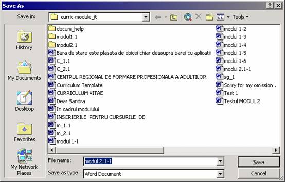 la prima salvare a documentului va apare caseta de dialog SaveAs (Fig. 3. 13) in care alegeti destinatia fisierului pe unul dintre suporturile de pastrare a informatie, prin deschiderea casetei cu lista derulanta Save In;