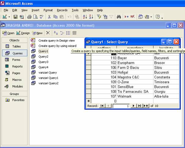 interogari : Queries - Desing View ( se alege campul ) - codul se transfera in tabel , se alege numele in ordine crecatoare sau descrescatoare, apoi se foloseste Like - se continua , se da nume .