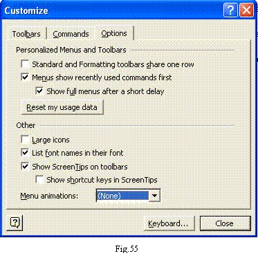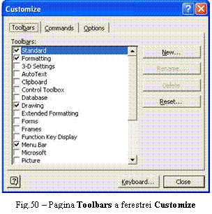 Toate operatiunile privind personalizarea interfetei programului Word se realizeaza prin intermediul casetei Customize (Fig.50) care poate fi apelata din meniul Tools Customize... (o metoda mai rapida de a accesa caseta Customize este efectuarea unui clic-dreapta cu mouse-ul pe oricare dintre meniurile sau barele de instrumente disponibile si selectarea optiunii Customize).