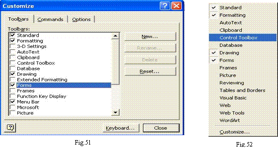 Selectând eticheta Toolbars din caseta Customize se pot stabili barele de instrumente ce urmeaza sa fie afisate în spatiul de lucru. De exemplu, în Fig.51, utilizatorul a optat pentru instrumentele standard, instrumentele de formatare, bara de instrumente Drawing si bara Forms. Aceeasi operatiune se poate realiza, relativ mai simplu, prin intermediul meniului View Toolbars sau efectuând clic-dreapta pe oricare dintre barele disponibile (Fig.52).