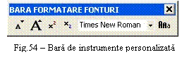 În Fig.54 este prezentata o bara personalizata pentru formatari la nivel de font. Este permis accesul rapid la diferite tipuri de fonturi, scrierea cu indice si exponent, marirea si micsorarea fonturilor precum si transformarea majusculelor în litere mici sau invers.