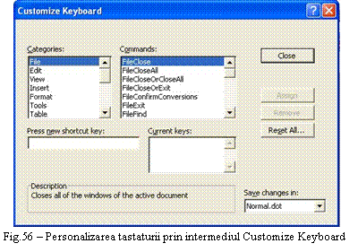În fereastra Customize Keyboard (Fig.56) putem selecta o categorie de comenzi din lista Categories pentru a alege instructiunea dorita din lista Commands. Automat în caseta Current Keys vor fi afisate scurtaturile de la tastatura existente pentru respectiva comanda. Pentru a seta o noua scurtatura de la tastatura ne vom plasa în caseta Press new shortcut key si vom apasa tastele dorite (sunt acceptate combinatii ale tastelor CTRL si ALT cu celelalte taste). În cazul în care combinatia este deja atribuita unei alte comenzi, vom fi avertizati printr-un text afisat deasupra casetei Description (daca ignoram acest lucru, combinatia de taste va functiona doar pentru ultima comanda careia i-a fost asociata).