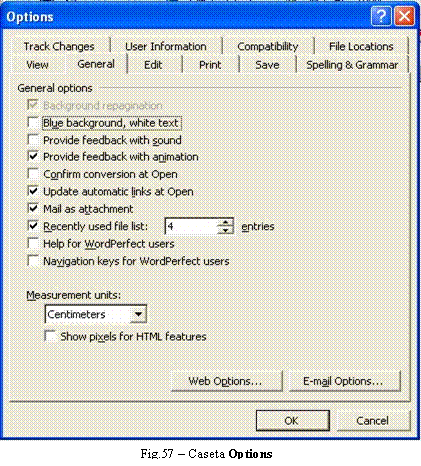 Deoarece o parte din aceste optiuni, precum cele de salvare a documentelor, au fost deja tratate în subcapitolele precedente, vom prezenta în continuare principalele optiuni privind vizualizarea, editarea, tiparirea si corectiile ortografice ce pot fi configurate prin intermediul casetei Options[1].