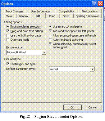 Pagina Edit a casetei Options (Fig.58) prezinta doua sectiuni: Editing Options - ce configureaza setarile referitoare la editare si Click and type - prezinta setari privitoare la stilurile implicite ce vor fi utilizate.