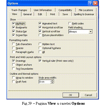 Pagina View a casetei Options cuprinde optiuni prin care se poate configura modul de afisare a textului pe ecran, a marcajelor de informare si a elementelor din interfata Word (cum ar fi barele de defilare). Pagina View a casetei Options (Fig.59), este împartita îm patru sectiuni: