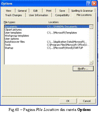Modifica locatiile implicite si calea de cautare a elementului selectat din lista Location (Fig.60) |